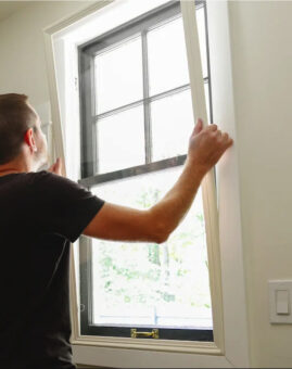 clear acrylic film sheet sandwiched between the frame components, they are custom made to the measurements of your window. The storm windows have a gasket or expandable foam seal around the edges to achieve a tight compression fit while allowing for easy installation and removal. They are amazingly strong, and the acrylic film will not easily stretch or tear. These convenient storm windows give you another layer of protection against the elements, creating an extra layer of insulation– like going from single pane to double pane windows. The clear acrylic film allows for good visibility without condensation on the inside, and provides added soundproofing from the outdoors. The only drawback is that you have to remove and store them once the weather warms up because you cannot open the windows with the inserts in place.
